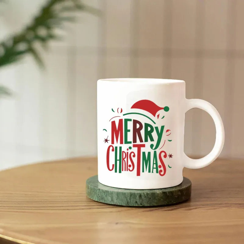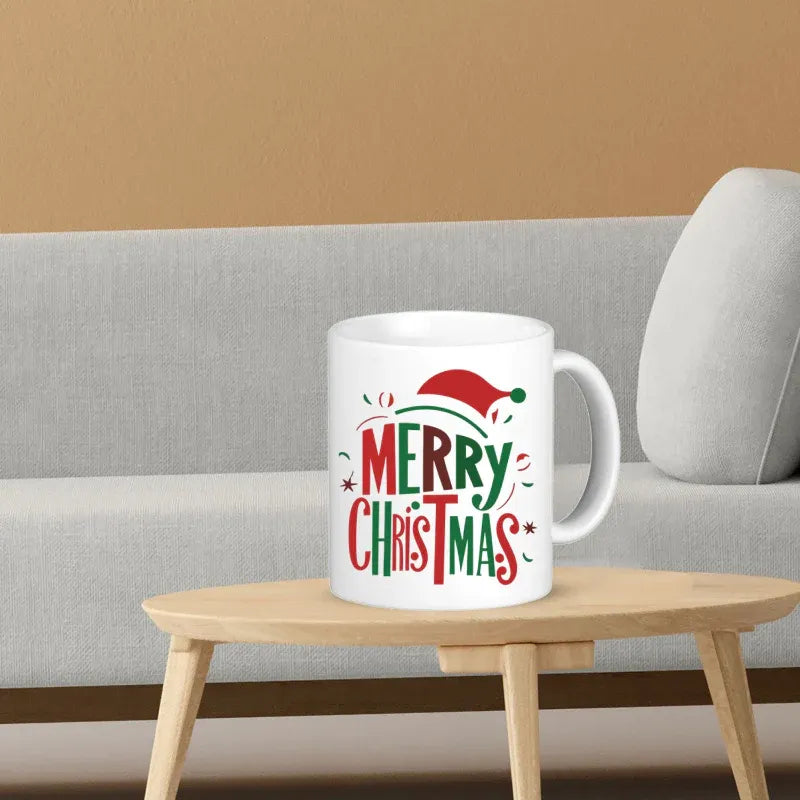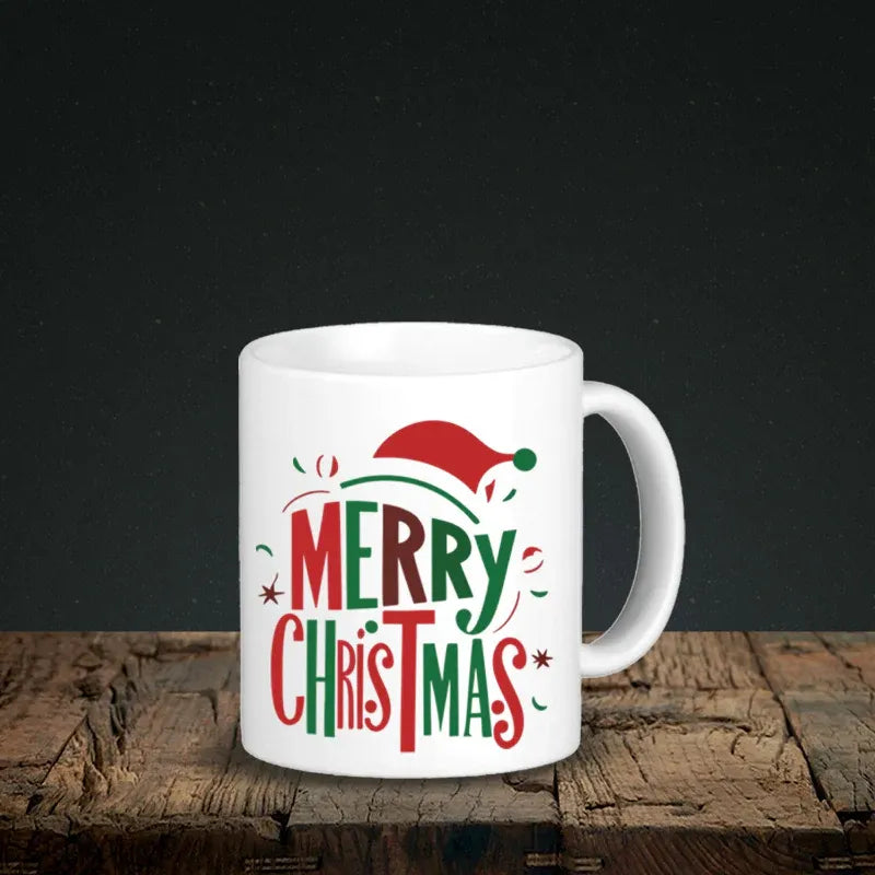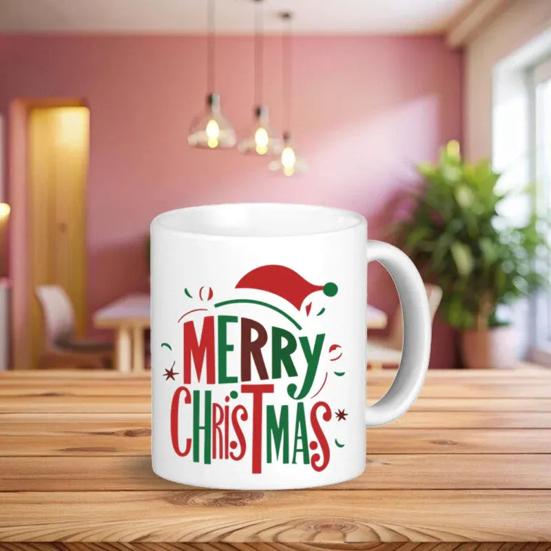 This Christmas coffee mug features bold red and green typography with playful Santa hat graphics—classic holiday design that never goes out of style. Quality ceramic Christmas mugs construction ensures durability through countless holiday seasons.