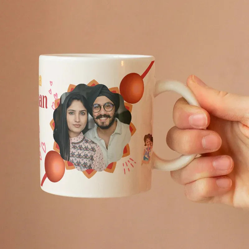 Celebrate the joy of Raksha Bandhan with our Cute Memorable Custom Ceramic Mug for Rakhi. Whether you're looking for a sis special gift or a bro special gift, this personalized Rakhi gift is sure to bring a smile to their face. Order now and make this Raksha Bandhan unforgettable with a gift that perfectly captures your bond and affection.