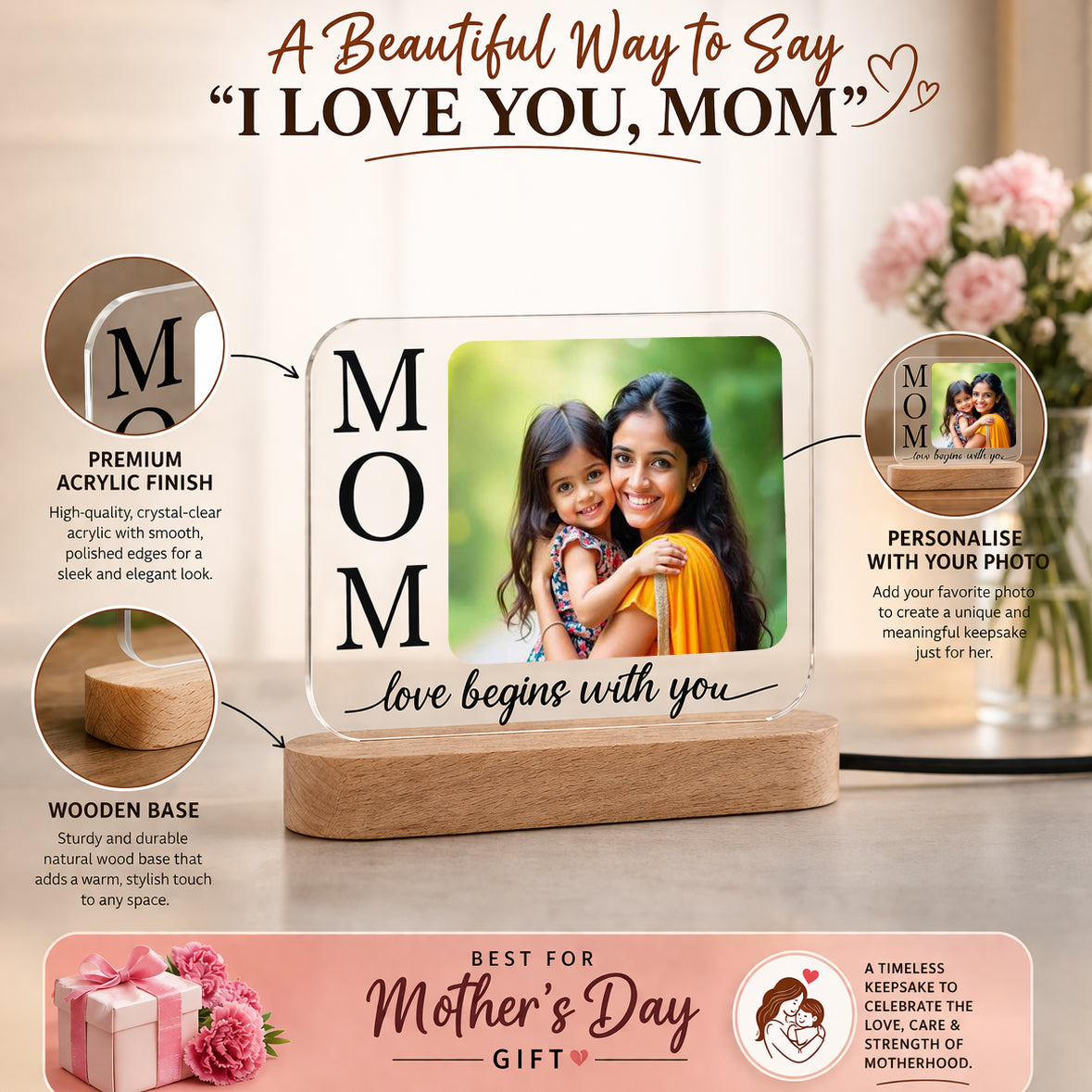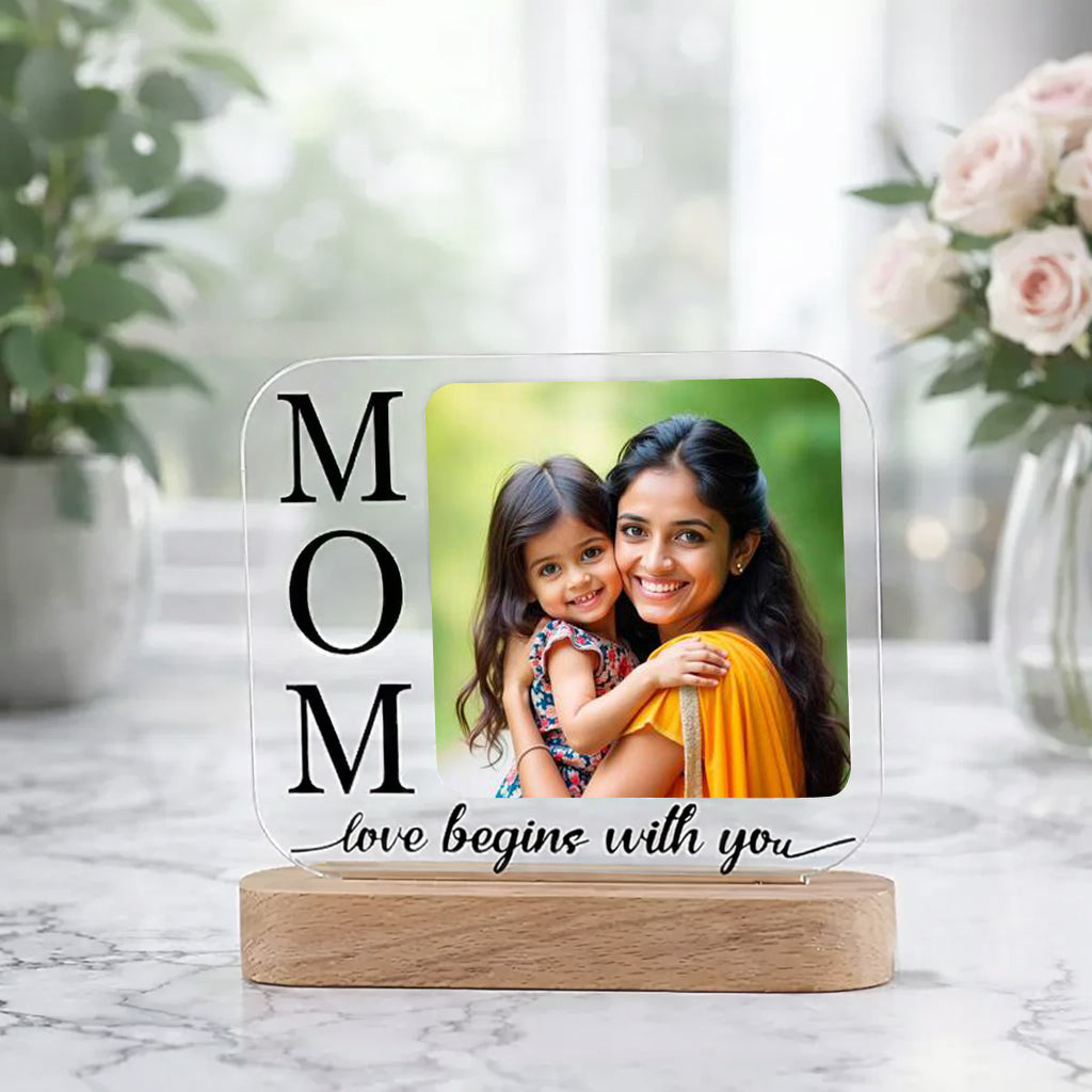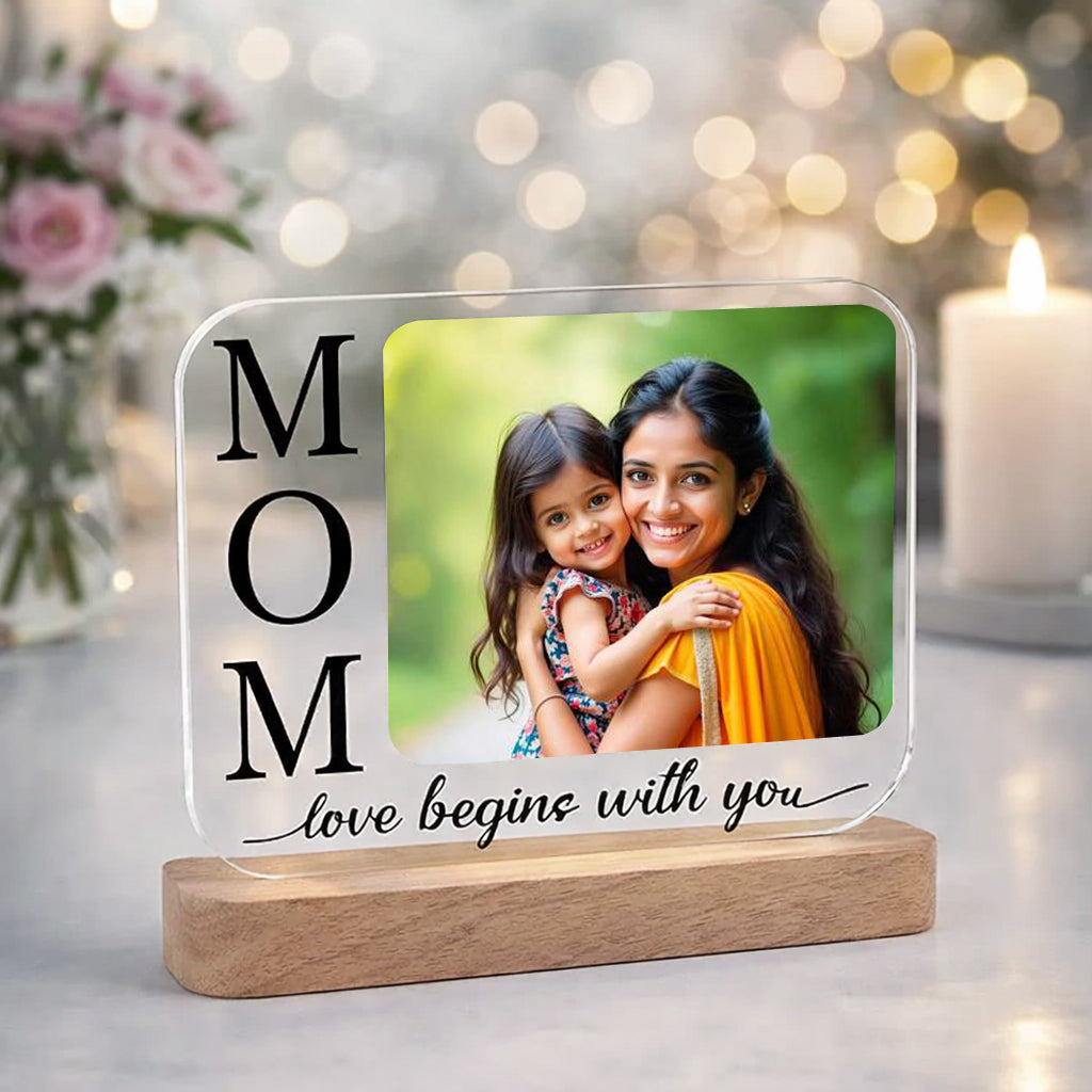 Featuring a customizable photo section and the heartfelt message “MOM – love begins with you”, this frame makes the perfect Mother’s Day gift, birthday gift, or surprise gift for mom.