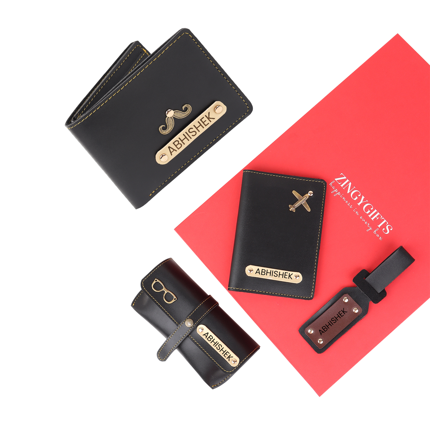 Inside this luxurious travel kit, you'll find: Custom Wallet, Sunglasses Case, Bag Tag, and Passport Holder.